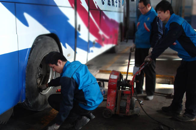 在汽車保修廠檢測(cè)線采訪小組觀看了班車安全檢測(cè)的全過(guò)程