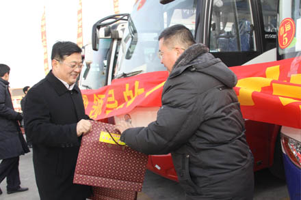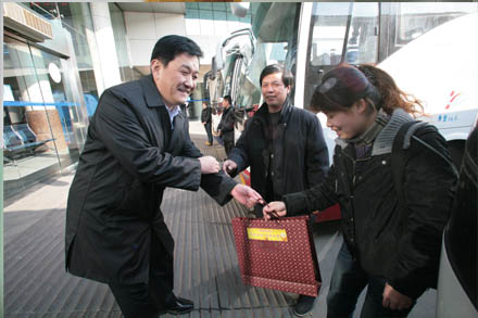2012年1月22日下午,集團(tuán)公司董事長、黨委書記吳宗昌、總經(jīng)理、黨委副書記王謙等集團(tuán)公司領(lǐng)導(dǎo)先后來到總站南、北兩區(qū),親切慰問仍然工作在春運一線的干部職工。兩站前廣場鞭炮齊鳴、煙花共舞,同慶即將到來的2012年新春佳節(jié)。