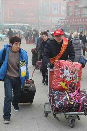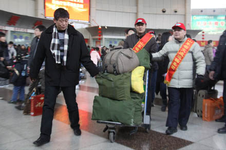 春運期間,盡管客流量較大,但集團公司各項創(chuàng)先爭優(yōu)活動和惠民服務措施始終有效開展。圖為集團公司總部黨員、團員組成小紅帽送溫暖義務服務隊、愛心志愿車隊,為旅客積極服務,受到廣大旅客歡迎。