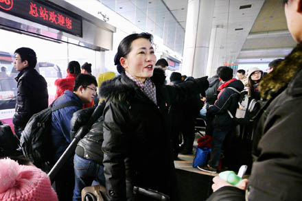 集團公司各車站黨員干部在春運中深化創(chuàng)先爭優(yōu),發(fā)揮黨員先鋒模范帶頭作用。圖為總站金牌檢票員李文為旅客熱情導乘。