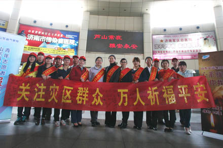 在總站候車大廳關注災區(qū)群眾、祈福平安簽字現(xiàn)場,設置了氣象災難、氣象預警及預防科普知識展板,志愿者將宣傳材料發(fā)放到每一名旅客手中,并邀請他們在簽名條幅上寫下對雅安地震災區(qū)群眾的祝福話語和姓名,為雅安的災區(qū)人民祈福。