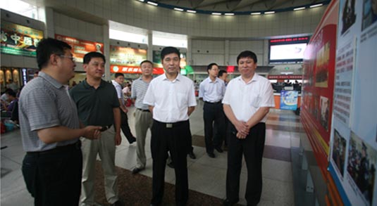7月19日上午,山東省國資委黨委副書記、紀(jì)委書記岳濱一行蒞臨集團(tuán)公司調(diào)研指導(dǎo)工作。集團(tuán)公司董事長(zhǎng)吳宗昌、總經(jīng)理王謙及部分領(lǐng)導(dǎo)班子成員陪同調(diào)研。期間,吳宗昌董事長(zhǎng)匯報(bào)了集團(tuán)公司基本概況和黨建、黨風(fēng)廉政建設(shè)工作開展情況,岳書記在聽取匯報(bào)后,與在座集團(tuán)領(lǐng)導(dǎo)進(jìn)行了深入座談,并做重要指示。最后,岳書記一行來到濟(jì)南長(zhǎng)途汽車總站進(jìn)行實(shí)地參觀指導(dǎo),與正在義務(wù)為旅客送水的十八大代表李文親切交談,并對(duì)總站女士售票窗口、人臉識(shí)別、3G視頻監(jiān)控等安全舉措給予了高度評(píng)價(jià)和肯定。