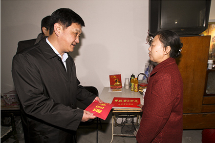 1月26日,省文明辦專職副主任王少杰、省文明辦綜合協(xié)調(diào)處副處長(zhǎng)耿為華、市委宣傳部副部長(zhǎng)、市文明辦主任彭壽謙、副主任曹湧在集團(tuán)公司董事長(zhǎng)、黨委書記吳宗昌、黨委副書記楊國(guó)強(qiáng)等同志的陪同下,親切看望了宋洋母親,分別為其送去慰問金、節(jié)日禮品和新春祝福。