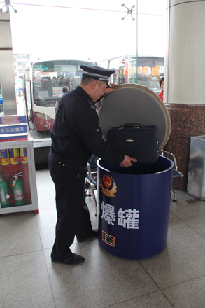 演練現(xiàn)場(chǎng)模擬車(chē)站治安科在巡邏中發(fā)現(xiàn)疑似爆炸物品行李箱,各崗位立即啟動(dòng)防爆應(yīng)急預(yù)案。防爆領(lǐng)導(dǎo)小組成員迅速按職責(zé)分工各就各位;應(yīng)急疏散、設(shè)備保障、綜合服務(wù)等小組對(duì)旅客進(jìn)行有序疏散;治安人員第一時(shí)間對(duì)現(xiàn)場(chǎng)進(jìn)行緊急處置;售票處按實(shí)戰(zhàn)標(biāo)準(zhǔn)停止售票、設(shè)置警戒區(qū),安全轉(zhuǎn)移票據(jù)票款。同時(shí)責(zé)任人員利用車(chē)站防爆桶實(shí)施險(xiǎn)情排除,通過(guò)調(diào)取監(jiān)控錄像等方式搜索嫌疑人,并及時(shí)實(shí)施抓捕,在確認(rèn)疑似爆炸物及恐怖襲擊隱患排除后,解除應(yīng)急狀態(tài),恢復(fù)正常運(yùn)輸秩序。