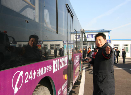 濟南市交通運輸局運管辦副主任崔建(左一)到發(fā)車場現(xiàn)場調(diào)度車輛營運工作。