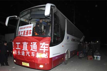 1月22日,汽車東站發(fā)出春運第一輛“民工直通車”,十六里河建筑工地的30多名農(nóng)民工朋友不出工作場地,直接坐上了返回家鄉(xiāng)安徽池州的直達班車。為做好這次直通車營運,東站提前做好周密細致的工作計劃,對車輛的審核、安全檢查、安全器械的配置和駕駛員資質(zhì)都做了嚴格要求,同時車上還配備了急救藥箱等應(yīng)急物品,確保農(nóng)民工朋友平安順利返鄉(xiāng)。2014年春運,汽車東站準備了十余輛班車待命,并通過聯(lián)系市內(nèi)各建筑工地,計劃開出“民工直通車”20班,切實幫助農(nóng)民工朋友順利返鄉(xiāng)。