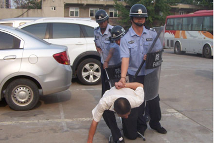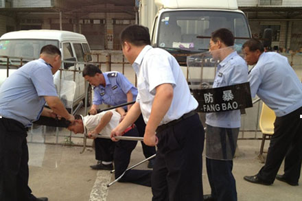 當(dāng)日下午16時30分,防暴恐實戰(zhàn)演練拉開帷幕,實戰(zhàn)演練背景是2名持刀“暴恐分子”在東站欲制造暴力恐怖襲擊。隨著站區(qū)一陣人群騷動,車場治安巡邏員發(fā)現(xiàn)一名“暴恐分子”正持刀傷害“旅客”。保安人員一邊厲聲喝止,迅速通過對講機(jī)呼叫增援,一邊用警用棍、防暴叉、防暴盾牌等武器威懾、控制嫌疑人,阻止其繼續(xù)實施傷害行為。與此同時,聽到對講機(jī)呼叫的防恐防暴隊迅速趕至現(xiàn)場,對嫌疑人形成包圍,并立即撥打110、120報警、急救電話。此時,隱藏在圍觀群眾中的另一名“暴恐分子”持刀挾持人質(zhì),意圖解救同伙。濟(jì)南特警支隊特警及時趕到,協(xié)助東站防恐防暴隊將第一名暴徒制服,并嚴(yán)辭警告劫持人質(zhì)的暴徒:“把刀放下,否則開槍了!” 暴徒見解救同伙無望,撒腿就跑,終在特警和治安人員共同努力下被抓捕制服。整個過程快速有力,不到5分鐘便處置完畢。